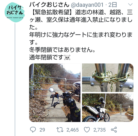 道志村猟友会「ジムニーやバイクが林道で狼藉するので封鎖したらゲート破壊されました」